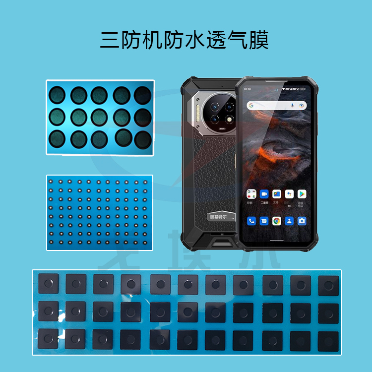 三防手機作為手機產品的細分市場,要求除了具備常規手機的功能之外,對防水、防摔、防塵等有著更為嚴苛的要求,防水透氣膜工程師專門為三防機市場打造了一條全方位解決方案的產品線,除了常規的防水、防腐、透氣、透音功能外,又增加了疏塵、超防塵、防鐵屑等亮點功能。